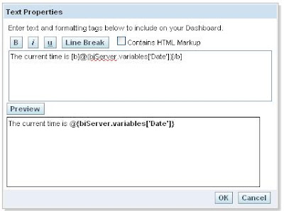 4. To add the variable to a narrative text. add the text dashboard object to the dashboard. click on properties of the text object and write
